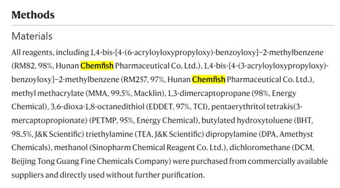 文章特意介紹使我公司 湖南嘉航醫(yī)藥科技有限公司(Hunan Chemfsh Pharmaceutical Co.Ltd.)提供的雙丙烯酸酯液晶單體(RM82和RM257)作為關(guān)鍵原料。RM82用于合成具有結(jié)晶能力的線性液晶聚合物(c-LCP),而RM257則用于制備主鏈液晶網(wǎng)絡(luò)(LCN)基體。這兩種單體的選擇對于實現(xiàn)LC-semi-IPN的優(yōu)異性能至關(guān)重要。通過合理設(shè)計和制備,LC-semi-IPN在機械性能和能量耗散能力方面相較于單一液晶網(wǎng)絡(luò)有了顯著提升。文章強調(diào)了CHEMFISH產(chǎn)品在合成高性能液晶聚合物中的關(guān)鍵作用,這些產(chǎn)品為開發(fā)新型能量耗散材料提供了重要支持。