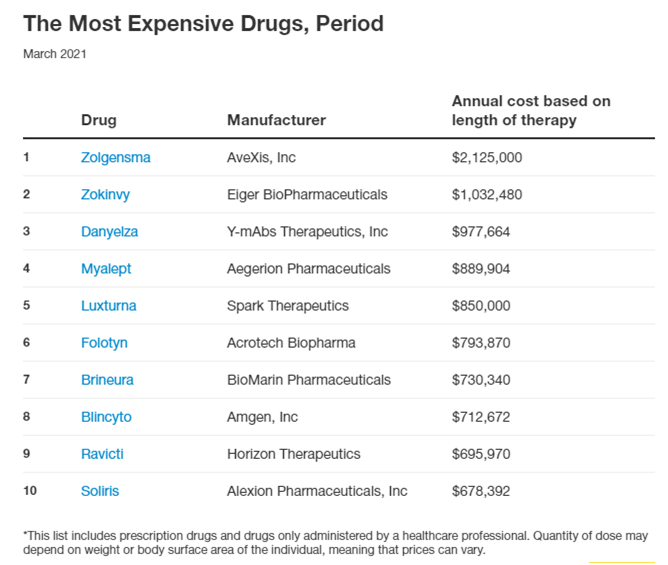 諾華用于治療脊髓性肌萎縮癥的基因療法Zolgensma以212.5萬美元的價格位居榜首。