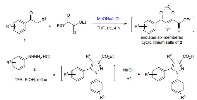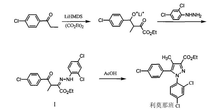 原研合成路線使用LiHMDS作為縮合試劑來介導對氯苯丙酮與草酸二乙酯的Claisen縮合,隨后與2,4-二氯苯肼環化制備關鍵中間體(I)。LiHMDS價格昂貴,用起來和用正丁基鋰注意事項差不多,要求無水無氧、低溫,而且會產生大量廢物,對反應條件要求苛刻。顯然,從成本經濟與綠色化學的角度考慮,LiHMDS不能夠適應大規模生產中間體1的實際要求。