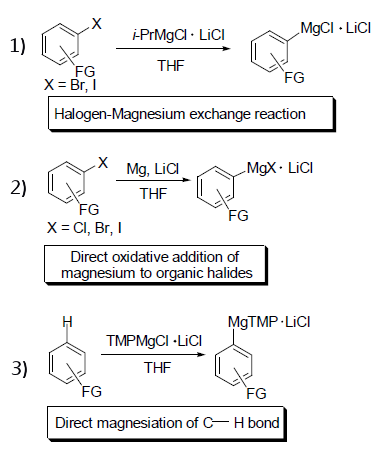 除了其特殊的綠色化學性,LiCl還可作為促進劑用于含多官能團格氏試劑的制備。這一方面,德國慕尼黑工業大學的Knochel小組做了許多開創性工作。Knochel等人根據各類反應條件和底物官能團兼容性的要求,開發了三種格氏試劑制備方法,極大拓展了格氏反應的應用范圍。由于Knochel 在格氏試劑合成與應用方面的杰出貢獻,通常將含LiCl 的格氏試劑稱之為Konchel型格氏試劑。