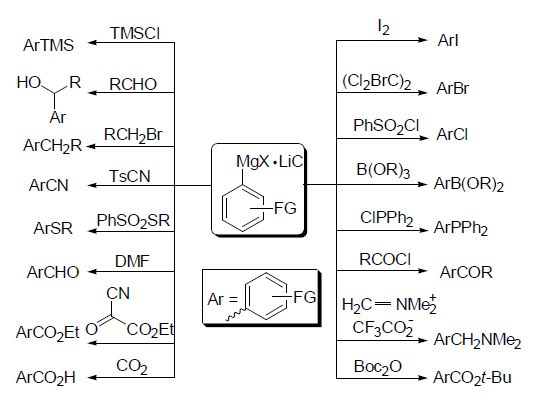 Knochel小組和其他小組發展出了很多基于格氏試劑官能團化的合成方法。例如,含多官能團的格氏試劑可以與酰氯、醛、酮、二氧化碳、亞胺、異氰酸酯、硼酸酯、鹵代烴、三烷基氯硅烷等各類親電試劑反應。