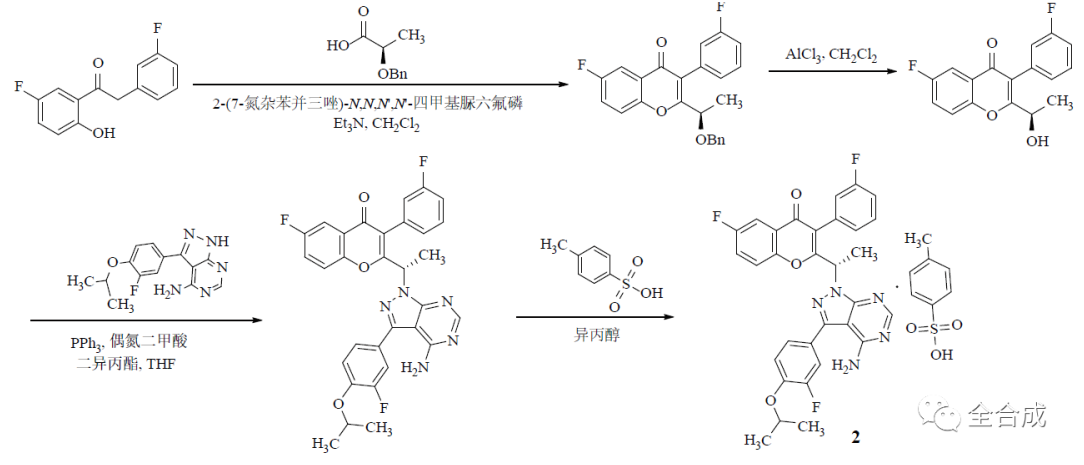 化學(xué)名:(S)-2-[1-[4- 氨基-3-(3- 氟-4- 異丙氧基苯基)-1H- 吡唑并[3,4-d] 嘧啶-1- 基] 乙基]-6-氟-3-(3- 氟苯基)-4H- 色烯-4- 酮對甲基苯磺酸鹽。