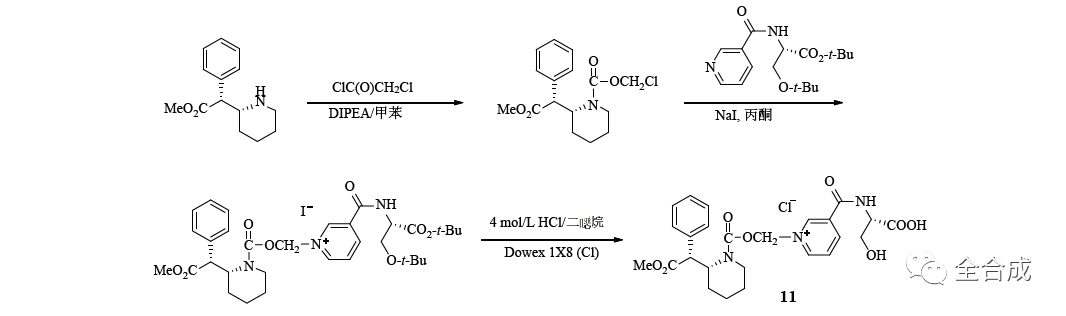 11 的化學(xué)名:3-[N-[(1S)-1- 羧基-2- 羥乙基]-氨甲酰基]-1-[[[(2R)-2-[2-(1R)- 甲氧基-2- 氧代-1- 苯乙基] 哌啶-1- 羰基] 氧基] 甲基] 吡啶鎓氯
