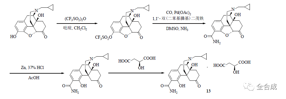 13 的化學(xué)名:17-( 環(huán)丙基甲基)-4,14- 二羥基-6- 氧代嗎啡喃-3- 甲酰胺 (2S)-2- 羥基丁二酸鹽。