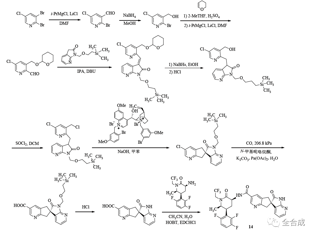 化學(xué)名:(3'S)-N-[(3S,5S,6R)-6- 甲基-2- 氧代-1-(2,2,2- 三氟乙基) -5-(2,3,6- 三氟苯基) 哌啶-3-基]-2'- 氧代-1',2',5,7- 四氫螺[ 環(huán)戊[b] 吡啶-6,3'-