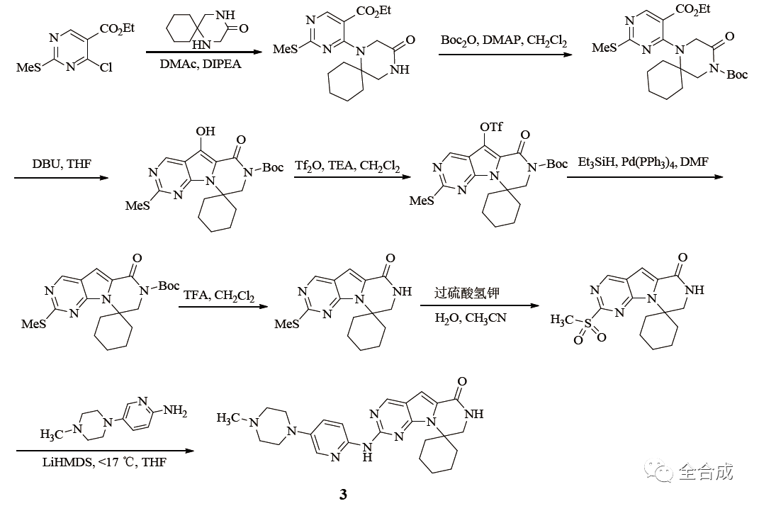 化學(xué)名:2'-[[5-(4- 甲基哌嗪-1- 基) 吡啶-2-基] 氨基]-7',8'- 二氫-6'H- 螺環(huán)[ 環(huán)己烷-1,9'- 吡嗪[1',2':1,5] 吡咯并[2,3-d] 嘧啶]-6'- 酮。