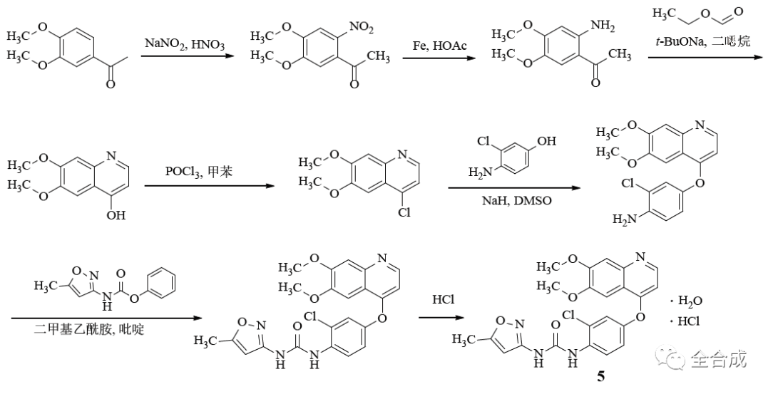 化學(xué)名:1-[2- 氯-4-[(6,7- 二甲氧基喹啉-4- 基)-氧基] 苯基]-3-(5- 甲基異唑-3- 基) 脲鹽酸鹽一水合物。