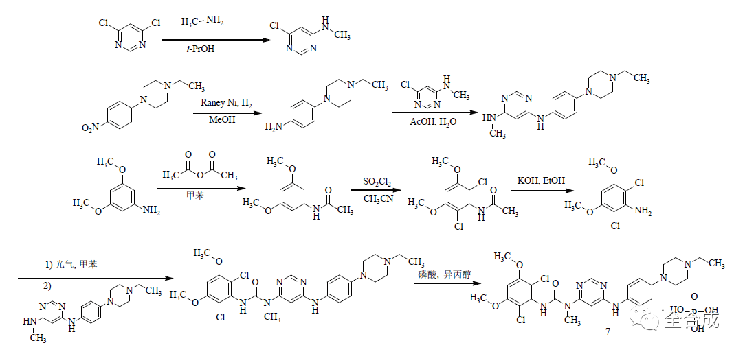 化學(xué)名:3-(2,6- 二氯-3,5- 二甲氧基苯基) -1-[6-[4-(4乙基哌嗪-1- 基) 苯氨基] 嘧啶-4- 基]-1-甲基脲磷酸鹽(1 ∶ 1)。