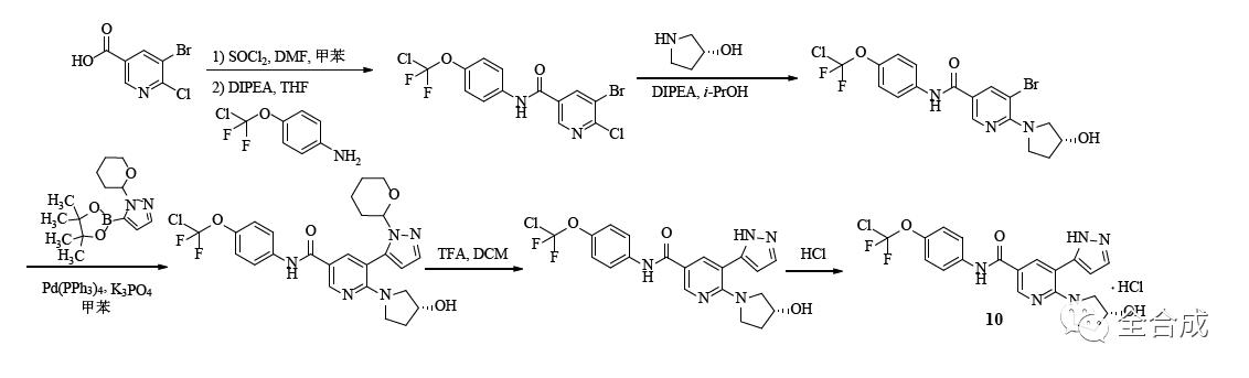 化學(xué)名:N-[4-( 氯二氟甲氧基) 苯基] -6-[(3R)-3- 羥基吡咯烷-1- 基]-5-(1H- 吡唑-3- 基)-吡啶-3- 甲酰胺鹽酸鹽(1 ∶ 1)。
