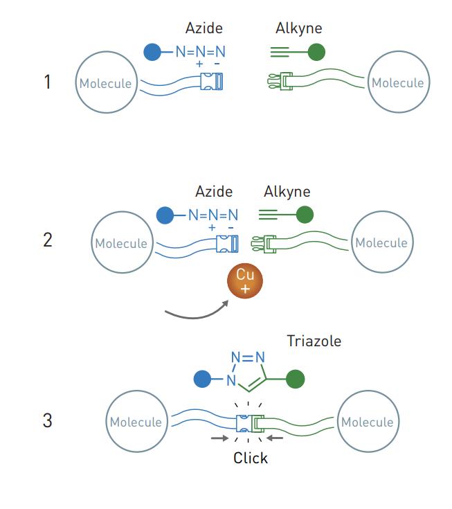 當銅離子加入后,疊氮化物和炔烴的反應變得極為高效。這種反應現在被廣泛應用,來以簡單的方式將分子連接在一起。