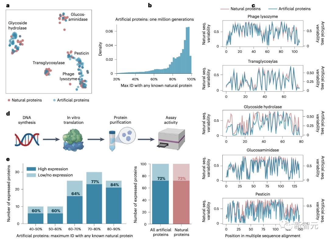 但研究人員在另一輪篩選中發(fā)現(xiàn),在AI生成的酶中,即使只有31.4%的序列與已知蛋白質(zhì)相同,也能表現(xiàn)出相當(dāng)?shù)幕钚砸约邦愃频慕Y(jié)構(gòu)。