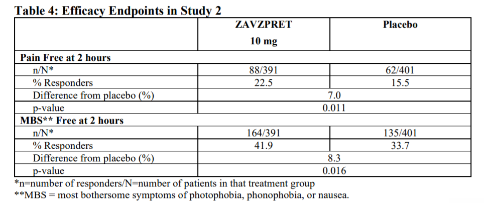 為了獲得FDA批準,輝瑞做了兩線三期試驗來證明本品的安全有效性。試驗一1 (NCT04571060)中,急性偏頭痛被隨機分為兩組,分別單次給予本品(n=623)或安慰劑(n=646)治療,結果顯示本品治療組中,23.6%的患者在2小時時實現了完全無頭痛(pain free),而安慰劑組僅為14.9%。本品治療組中,39.6%的患者偏頭痛特性性最不適癥狀(畏光、怕聲、惡心等)消失,而安慰劑組僅有31.1%的患者達到這一水準。試驗二的設計與試驗一類似,試驗結果如下所示: